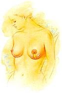Incisions following the breast's natural contour define the area of excision and the new location for the nipple and areola. Skin in the shaded area is removed, and the nipple and areola are moved to a higher position.