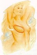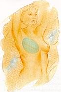 In one method, the breast is reconstructed using a tissue flap – consisting of a portion of skin, fat and muscle – that is taken from the back, or abdomen. (See Figure D.) The flap, still tethered to its original blood supply, is tunneled beneath the skin to the front of the chest wall. (See Figure E.) The transported tissue may be bulky enough to create a new breast mound itself. However, sometimes an implant will be inserted as well.